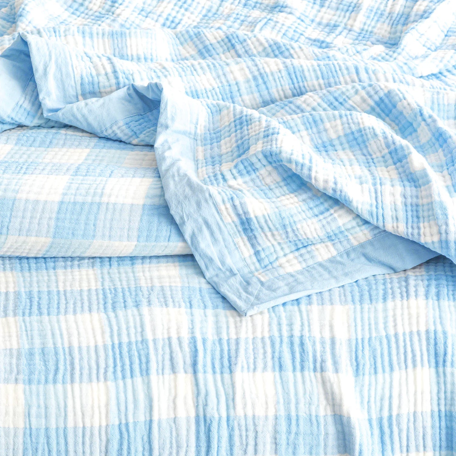 Renee Taylor Gingham Washed Cotton Yarn Dyed Revesible Textured Blanket French Blue