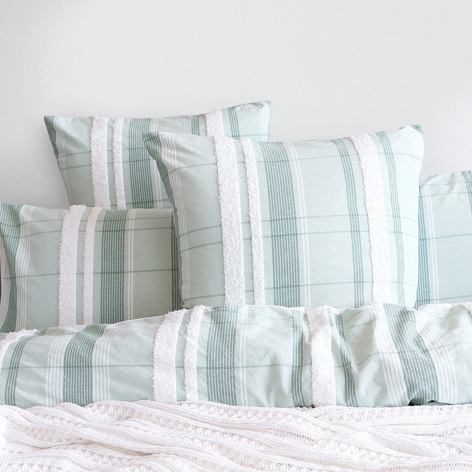 Experience effortless elegance with our yarn-dyed tufted jacquard quilt cover set. Featuring soothing sage green stripes offset by creamy white tufted accents, this design exudes a calm, airy vibe—perfect for relaxed coastal, Scandinavian, or Hamptons-style interiors. The textured fabric adds depth & softness, making it not just visually beautiful but incredibly comfortable to sleep in. Crafted for modern lifestyles, this quilt cover blends timeless charm with today’s relaxed, natural living. Complete your set with matching European pillowcases.